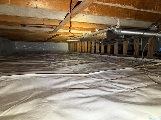 After that, we sealed the crawl space with a liner that was carefully fastened and air-sealed around the footings, piers, and near the top of the foundation walls. Where insulation was already in place, we finished the liner neatly in front of it for a clean look.