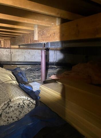 A full crawl space encapsulation system was installed and carefully sealed around footings, piers, and along the foundation walls to keep moisture out. During the installation, the existing adjustable support jacks were temporarily removed so the liner could be properly placed. Once complete, the jacks were reinstalled on top of the liner and tightened to stabilize the support beam. The bottoms of the piers were also wrapped for added protection.