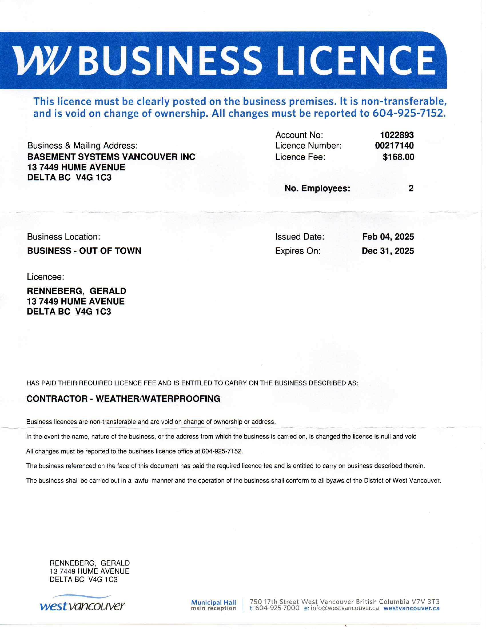 Basement Systems Vancouver is licensed to do business throughout Greater Vancouver, meeting licensing requirements and following professional standards. Please see copies of our business licenses below.