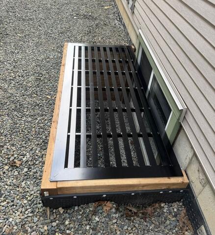 A new window well was constructed using treated lumber for long-lasting protection. To further prevent moisture buildup, a drainage mat was installed along the exterior and finished neatly with a mould strip at the top edge. The area was then backfilled with soil and completed with a custom-made aluminum grill, providing a durable, clean, and secure finish.